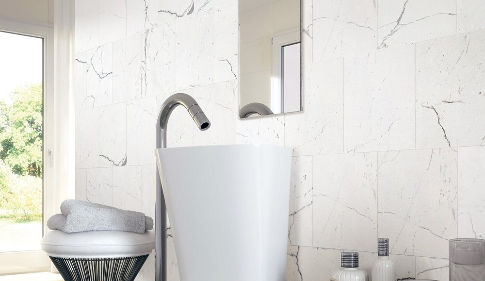 Pietra Statuario源自闻名世界的意大利卡拉拉采石场,承袭了卡拉拉石材质地坚硬、密度大的特性。浅灰色斜纹、疏密有度,与洁白通透的背景相互辉映,浅浅地宣扬着内在的石材基因,非常适合追求洁净和时尚的商用或家居空间。